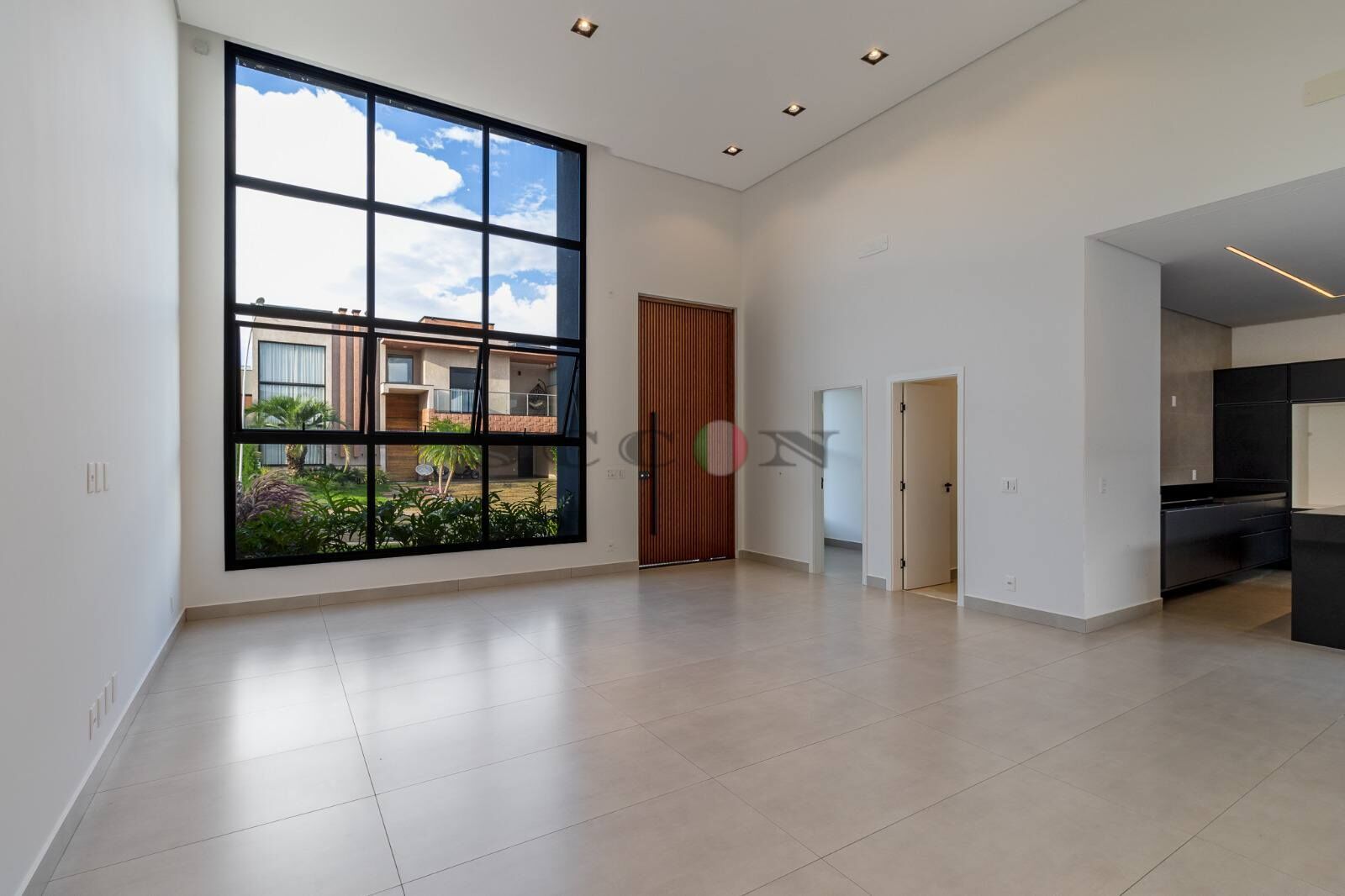 Ampla sala de estar e jantar com pé direito duplo de 5 metros, integrada à cozinha;