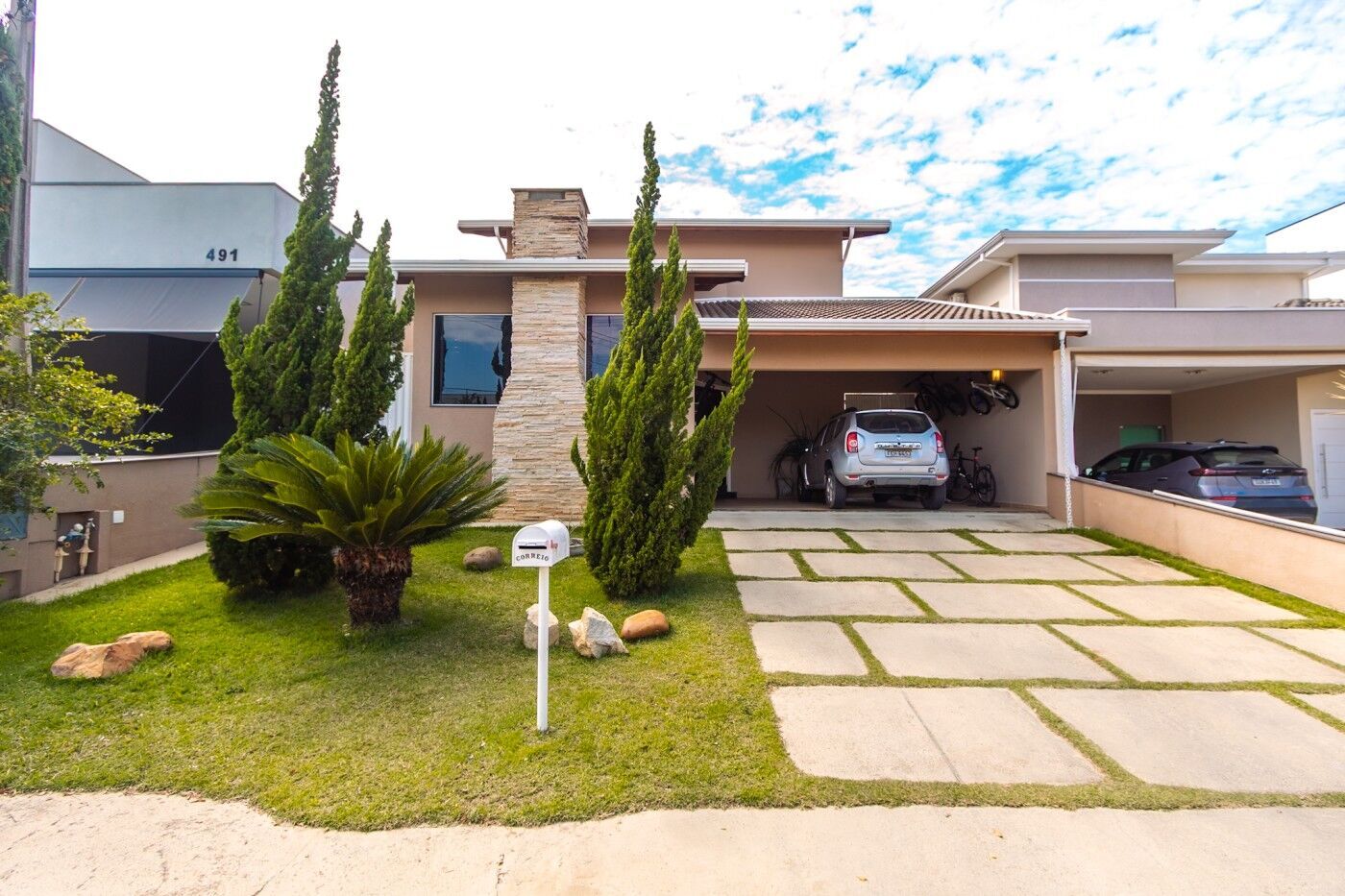 O sobrado conta ainda com um sótão de 80m² com piso, iluminação e infraestrutura com escada móvel embutida na laje. A garagem comporta 4 carros, sendo 2 cobertos.