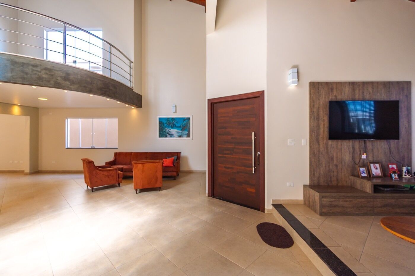 Uma escada projetada estrategicamente com corrimão e guarda corpo em aço inox leva ao piso superior onde podemos encontrar uma sala tipo mezanino com varanda e 3 dorms, sendo 1 suíte com closet e banheira jacuzzi. Os outros dois quartos são atendidos por um banheiro social.